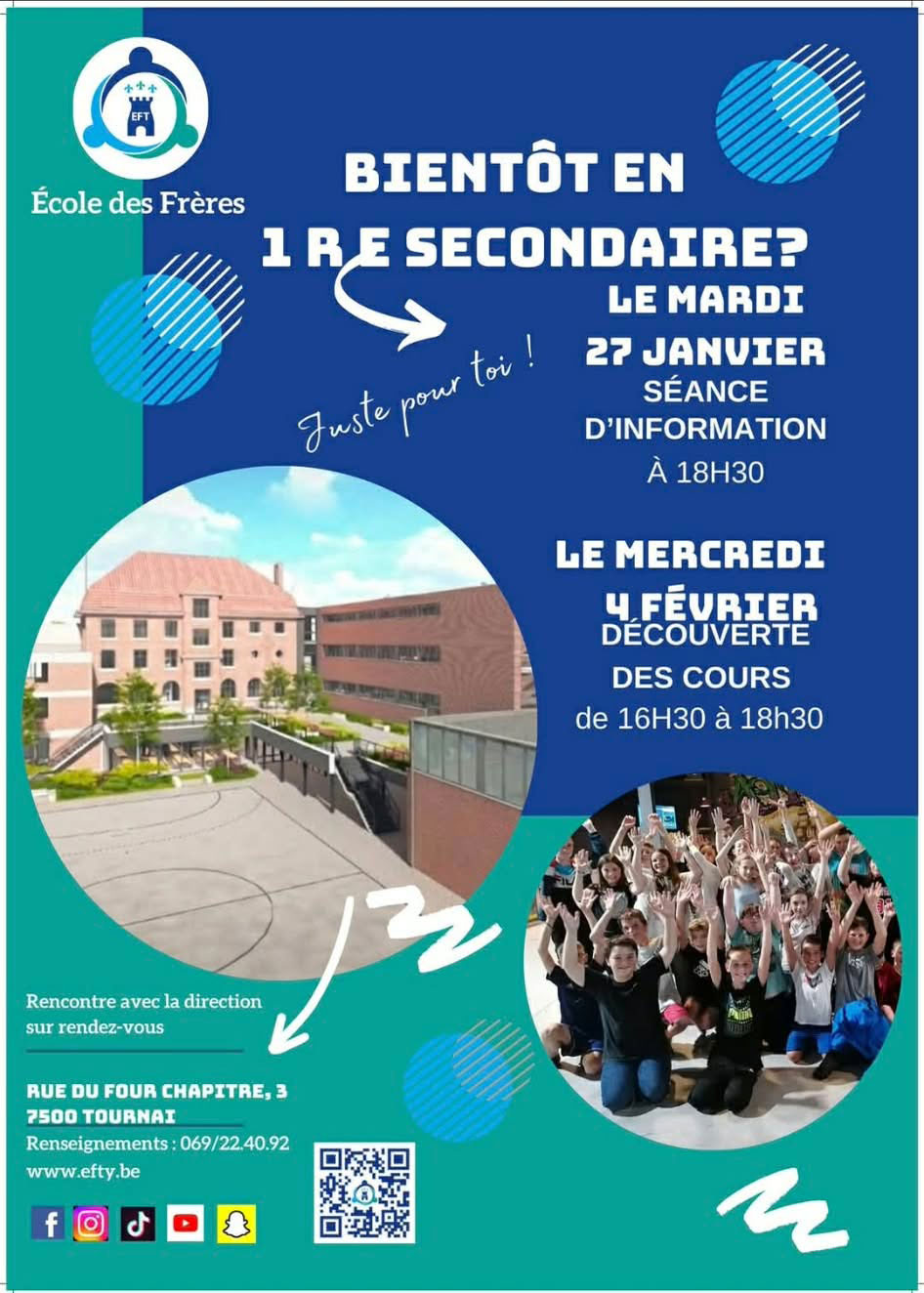 L’École des Frères organise plusieurs moments d’information à destination des élèves qui seront bientôt en 1ère secondaire. Une séance d’information, spécialement pensée pour toi, aura lieu le mardi 27 janvier à 18h30. Une seconde rencontre est prévue le mercredi 4 février, avec une découverte des cours de 16h30 à 18h30.